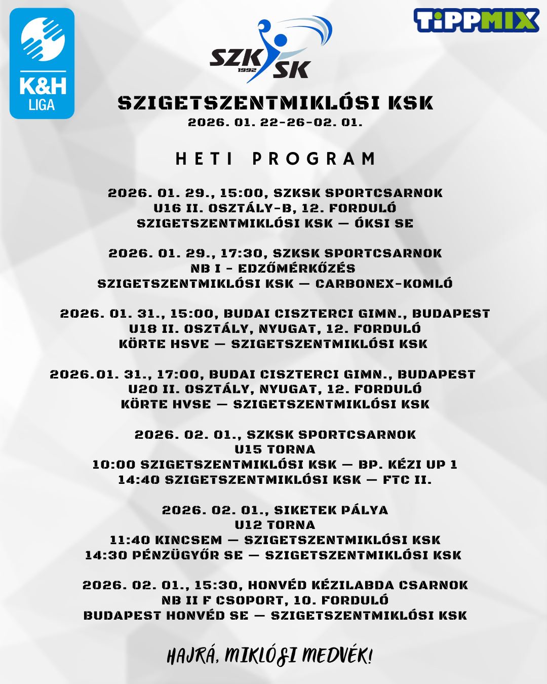 Január 29-én, csütörtökön hazai környezetben lép pályára utoljára a bajnoki folytatás előtt az Szigetszentmiklósi KSK NB I-es férfi kézilabdacsapata.