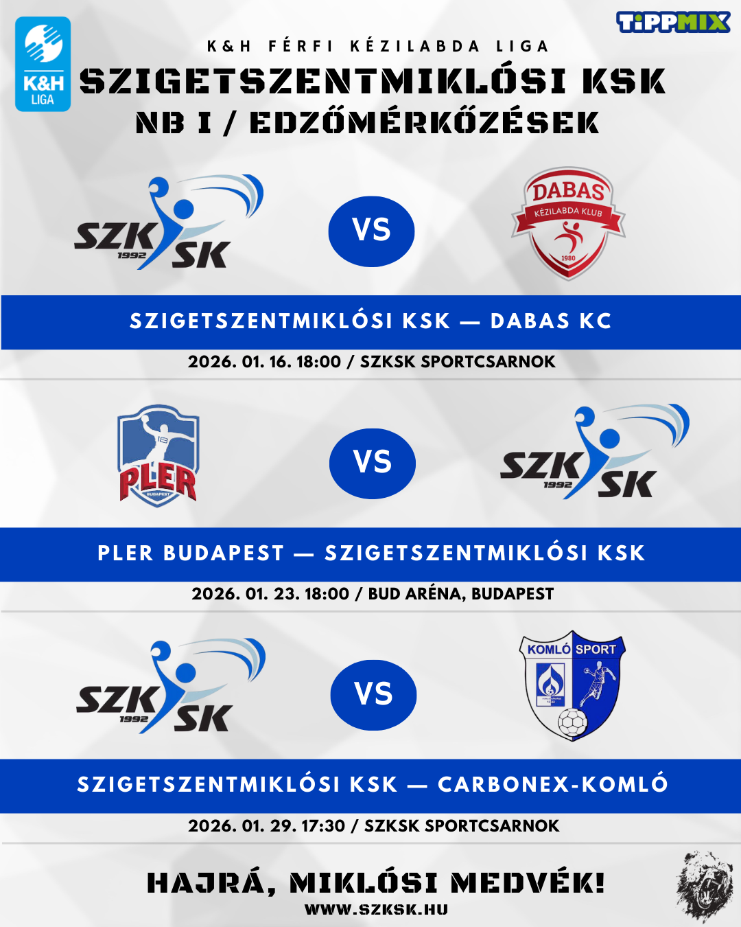 Az NB I-es bajnokság folytatása előtt három edzőmérkőzést játszik januárban a Szigetszentmiklósi KSK felnőtt férfi kézilabdacsapata.